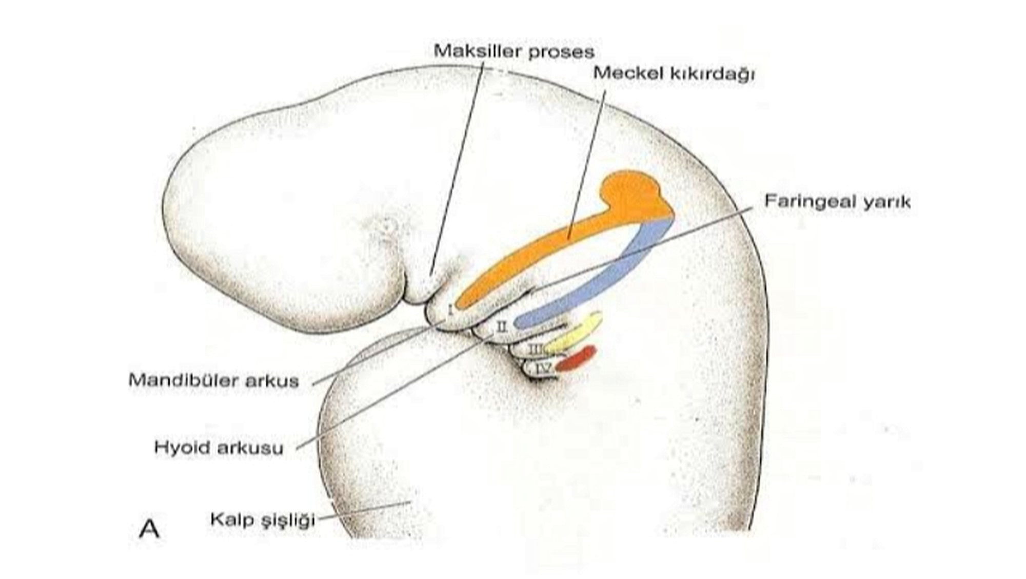 İlk faringeal ark (mandibular ark): Çene kemikleri, bazı yüz kasları ve orta kulak kemikleri (örneğin malleus ve incus) bu yaydan türetilir.