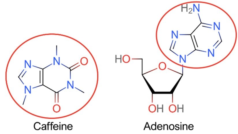 Kafein, hem A1 hem de A2A reseptörleri için kabaca eşit derecede yüksek afiniteye sahip güçlü bir adenozin reseptörü antagonistidir.[8]