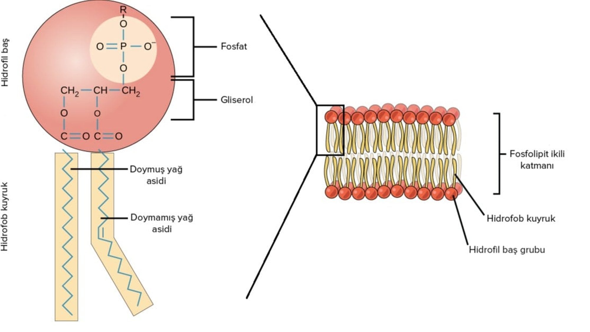 Bir molekül gliserol iki yağ asidi ve bir fosfat grubundan oluşan fosfolipit hücre zarının yapısını oluşturur.Kuyruk kısmı hidrofobik(su sevmeyen)baş kısmı iş hidrofilik (su seven)dir. Fosfolipit hücre zarının çift tarafını oluşturur kuyruk kısmı doymuş yağ asidi ve doymamış yağ asidin den oluşur baş kısmı ise fosfat grubundan ve gliserol den oluşur.