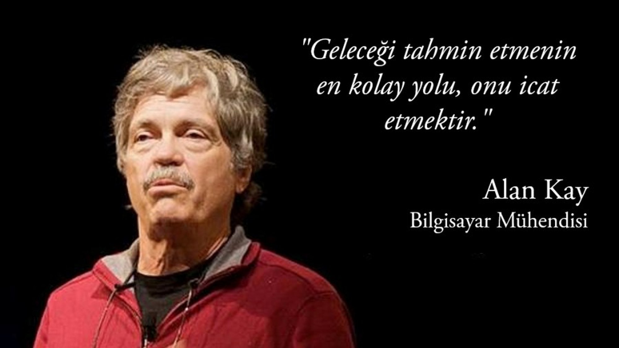 Alan Kay, Amerikan Sanat ve Bilimler Akademisi, Ulusal Mühendislik Akademisi, Kraliyet Sanat Akademisi üyesi, geleceğe yön veren mühendislerden birisi. Özellikle nesne-odaklı programlama ve grafik kullanıcı arayüzlerindeki pencelerin (kabaca, şu anda açıp kapattığınız bilgisayar pencereleri) üzerinde yaptığı araştırmalarla biliniyor. Daha spesifik konuşmamız gerekirse Kay, bu alanın kurucu babalarından biri. Belki 3 sene boyunca "Atari" firmasının baş araştırmacısı olması, Apple'da Gelişmiş Teknoloji Grubu'nda görev almış olması, Walt Disney Hayal Mühendisliği'nde çalışmış olması, onunla daha iyi bir bağ kurmanızı sağlayabilir. Kyoto Üniversitesi ve MIT'de profesörlük yapan Kay, aynı zamanda profesyonel bir jazz gitaristi.