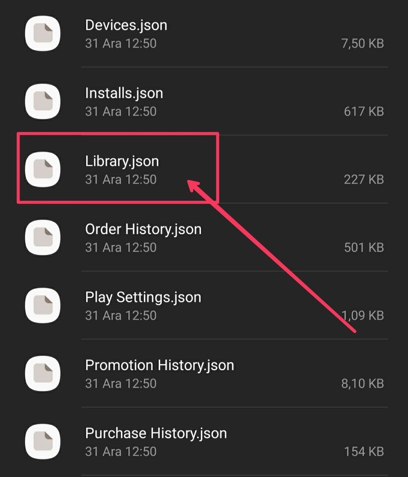İndirilen zip dosyasını çıkartın ve dosyanın içinde bulunan Google Play Store isimli klasöre girin ve Library.json dosyasını açın. (.zip ve .json dosyalarını açmak için ek bir uygulama indirmeniz gerekebilir.)