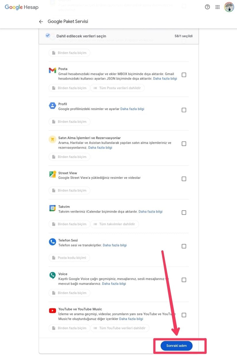 (İsterseniz https://takeout.google.com/?hl=tr adresine giderek 2.Adım'dan devam edebilirsiniz.)