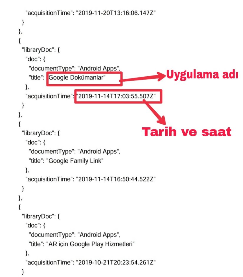 Açtığınızda dosyayı böyle görebilirsiniz uygulama adı ve uygulamanın indirildiği tarih ve saati gösterdiğim gibi görebilirsiniz. (Not: Subscription veya In App Item yazıyorsa satın aldığınız uygulama içi ürün veya aboneliktir. İndirdiğiniz uygulama tarihleri ve saatleri dışında uygulamalara satın aldığınız uygulama içi ürünler ve aboneliklerin tarih ve saatleri de yazmaktadır dosyanın içinde.)