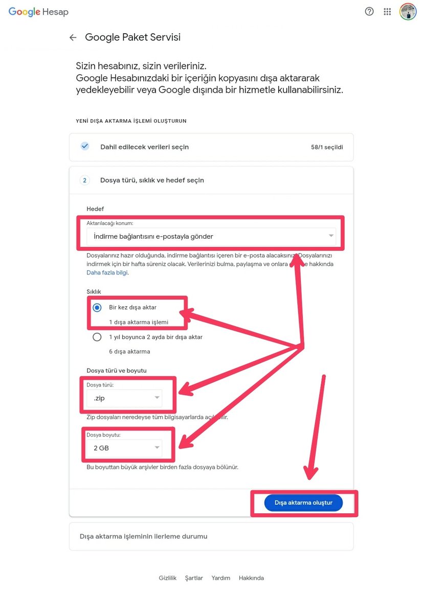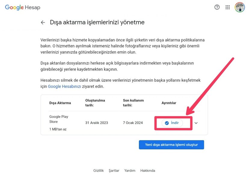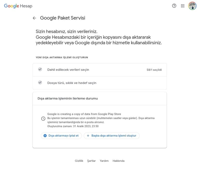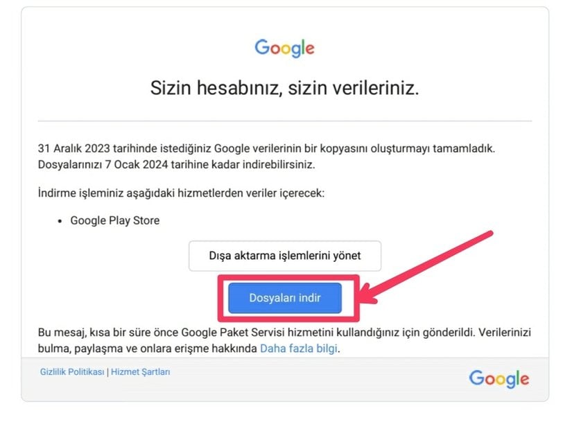 Aşağıdaki görüntüdeki e-postadaki linke tıklayın e-posta gelmemiş ise https://takeout.google.com/?hl=tr adresine giderek 7. veya 8. Adım'dan devam edebilirsiniz.