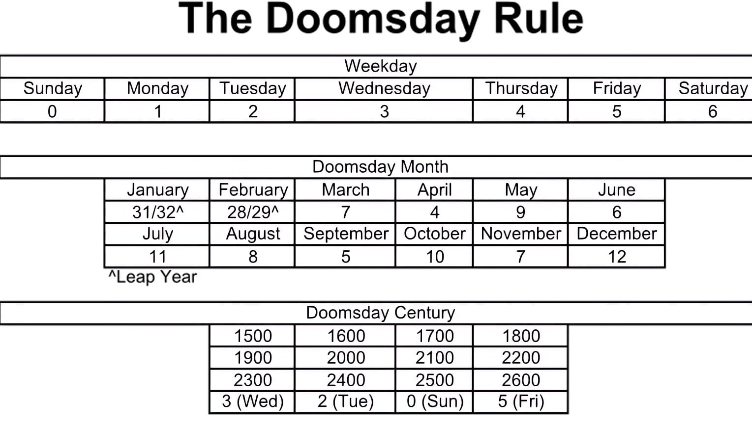- ^ K. Bikos. The Doomsday Rule. Alındığı Tarih: 22 Mart 2023. Alındığı Yer: Time and Date | Arşiv Bağlantısı