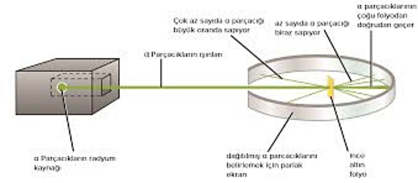 Yapmış olduğu altın levha deneyinde alfa ışınlarının büyük bir kısmının levhadan geçtiğini ve bir kısmınında saptığını görmüştür. Bu deneye göre atomların büyük kısmı boşluktur, protonlar merkezde toplanmıştır ve elektronların serbest halde dolaştığını söylemiştir. Çekirdeğin de boyutunu belirlemek için şunu söylemiştir: “Atomu futbol sahası kadar büyütebilseydik çekirdek pinpon topu kadar olurdu!” Ayrıca yaptığı kütle ölçümlerde atomun kütlesinin yaklaşık yarısını oluşturduğunu, bununla beraber yaklaşık diğer yarısını oluşturacak üçüncü bir parçacığın olması gerektiğini öngördü fakat bunu deneysel olarak ispatlayamadı.