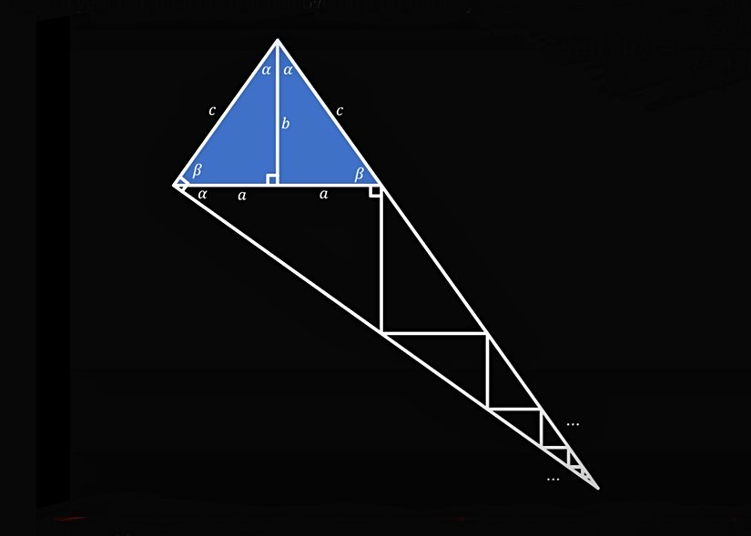 Üçgenlerimizin hepsi α, β ve 90° açılarından oluştuğundan ve çizdiğimiz ilk üçgenin β açısı ile çizdiğimiz son üçgenin üçgenin α açısının toplamı da 90° olduğundan yeni bir dik açı elde ettik. Eğer çizdiğimiz son üçgenin kenarlarını hesaplamak istersek ve β açısının baktığı kenarın uzunluğunun 2a, sinβ değerinin b/c, ve sinα değerinin a/c olduğu bilgilerini kullanırsak tüm kenar uzunluklarını gösteren şekilde üçgenlerimizin kombinasyonu şu şekilde olur: