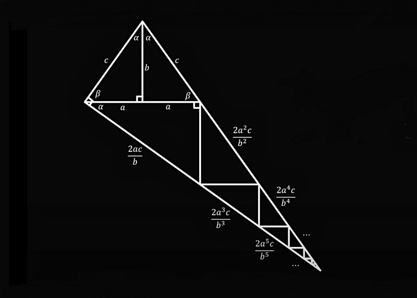 Kenar uzunluklarını dikkatli bir şekilde incelediğimizde ölçeklendirilip döndürülerek oluşturulan iki hipotenüsün birbirlerine a/b oranı ile benzediklerini görürüz. Bu durumda sol taraftaki hipotenüslerin uzunlukları a/b çarpanının tek kuvvetlerini içerecek biçimde ilerlerken sağ taraftakilerinki ise çift kuvvetlerini içerir