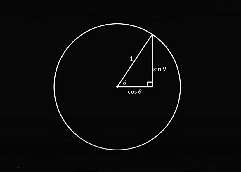 Bu sefer hipotenüsümüzü 1, açılarımızdan birini ise θ kabul edelim. θ açısının baktığı dikey kenara sinθ, bu kenara dik olan yatay kenara ise cosθ deyip, merkezi θ açısının bulunduğu köşe noktası olan bir birim çember çizelim.