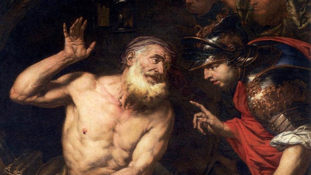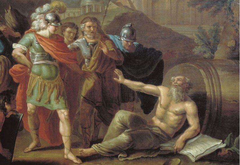 Pek çoğumuz, Büyük İskender ile aralarında geçen kısa bir diyalogdan tanır Diyojen’i: Büyük İskender “Dile benden ne dilersen.” der ve Diyojen, “Gölge etme başka ihsan istemem.” der.