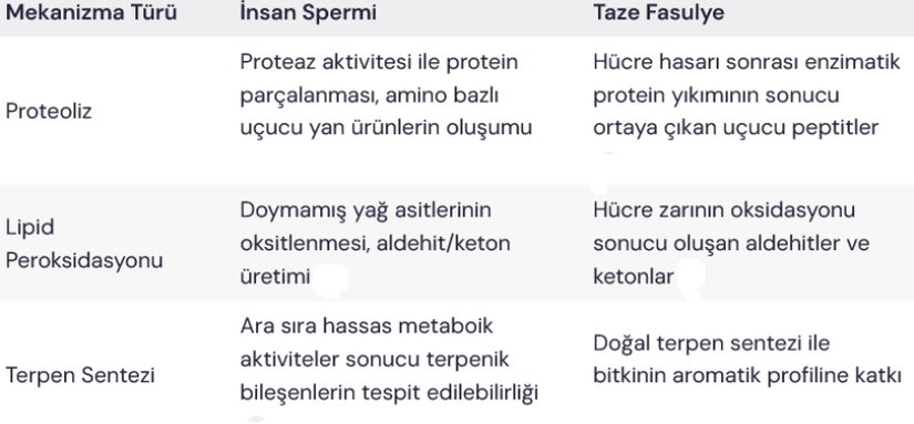 Aşağıdaki tablo, insan spermi ile taze fasulyenin uçucu bileşik üretiminde etkin olan mekanizmaları karşılaştırmalı olarak özetler: