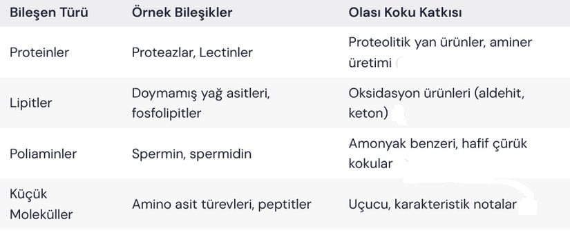Aşağıdaki tabloda, insan sperminin ana moleküler bileşenleri ve bu bileşenlerin koku profiline olası katkıları özetlenmiştir: