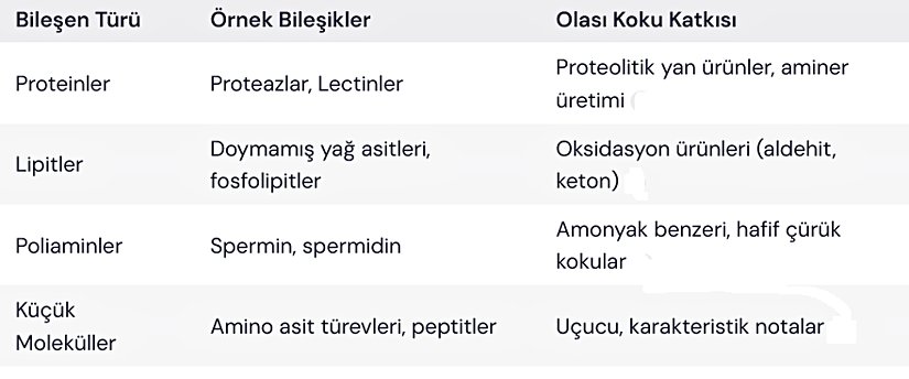 - Proteoliz ve Amin Üretimi: Proteinlerin parçalanması sonucu ortaya çıkan uçucu aminlerin benzer kokusal profillere katkıda bulunduğu gözlenmektedir.[4]