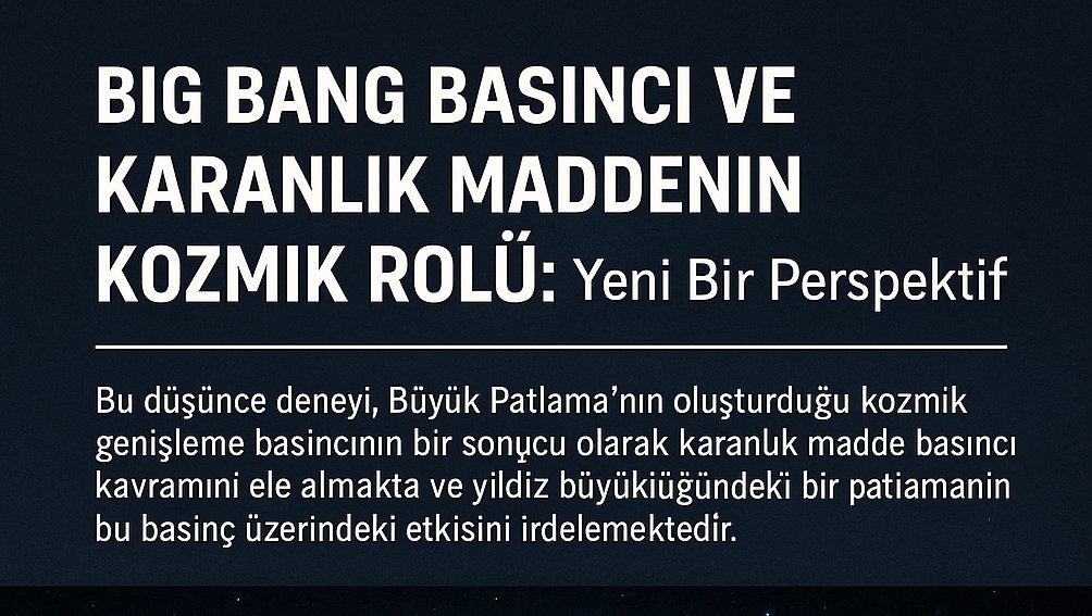 Karanlık madde, evrenin toplam kütle-enerjisinin büyük bir kısmını oluşturmasına rağmen, doğrudan gözlemlenemeyen ve doğası halen belirsiz bir kozmik fenomen olarak kalmaktadır. Bu çalışma, karanlık maddeyi geleneksel madde tanımından farklı olarak, Big Bang’in evrene yaydığı kozmik basıncın fiziksel bir tezahürü olarak varsayar.