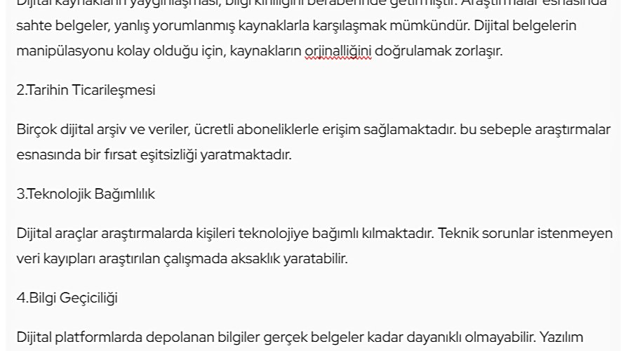 Dijitalleşme, tarih araştırma ve yazım süreçlerinde bir devrim niteliğinde kolaylıklar getirmiştir. Fakat dijital ortamın sunduğu sınırsız fırsat kadar zorlukları da beraberinde getirmiştir. Tarihçiler, yeni çağda geçmişi geleceğe taşırken hem dijital dünyayı hem de geleneksel yöntemleri bir arada kullanarak denge sağlamalıdır.[1], [1], [1], [1]