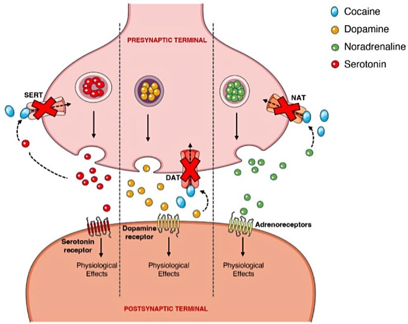 Öte yandan, kokainin psikoaktif ve sempatomimetik etkileri serotonin, noradrenalin ve dopaminin geri alımından sorumlu presinaptik taşıyıcıların bloke edilmesinden kaynaklanmaktadır. İkincisi söz konusu olduğunda, sinaptik yarıktaki presinaptik dopamin taşıyıcısının (DAT) bloke edilmesi, dopaminerjik postsinaptik reseptörlerin aşırı uyarılmasıyla dopaminde hücre dışı bir artışa neden olarak öforik 'hücumu' tetikler. Bu seviyedeki diğer tolerans mekanizmaları, disforik bir 'çöküş' olarak yaşanan dopamin seviyelerindeki müteakip düşüşten sorumludur. Yakın zamanda yapılan bir meta-analiz, kronik kokain kullanıcılarının striatum, kaudat ve putamen beyin bölgelerindeki D2 ve D3 dopamin reseptörlerinde önemli bir azalma ve striatumun her yerinde önemli ölçüde artmış bir DAT mevcudiyeti sergilediğini göstermiştir.