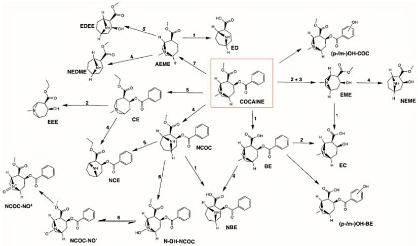 Kokain iki ana metabolit verir: Her ikisi de ekgonine (EC) daha fazla hidrolize uğrayabilen EME ve BE. EME, sırasıyla PChE ve karboksilesteraz tip 2 (hCE2) etkisiyle plazmada ve karaciğerde oluşan farmakolojik olarak inaktif bir metabolittir. Tüm uygulama yolları için kokainin diğer önemli inaktif metaboliti olan BE, fizyolojik pH'da kendiliğinden veya karaciğerde hCE1 tarafından oluşturulabilir. Kokain ayrıca sitokrom P450 (CYP) enzimi CYP3A4 tarafından N-demetilasyona uğrayarak kan-beyin bariyerini (BBB) geçebilen oldukça hepatotoksik bir metabolit olan norkokain (NCOC) oluşturabilir. NCOC, absorbe edilen kokainin yaklaşık %5'ini oluşturur ve beyin sinaptozomları tarafından noradrenalin alımını inhibe etmede ana ilaçtan daha güçlü bir lokal anestezik ve daha etkili olarak tanımlanmıştır. BE ve EME, CYP tarafından daha fazla N-demetilasyona uğrayarak sırasıyla norbenzoilekgonin (NBE) ve norekgonin metil ester (NEME) üretebilir. Diğer minör metabolitler meta-hidroksibenzoilekgonin (m-OH-BE), para-hidroksibenzoilekgonin (p-OH-BE), meta-hidroksikokain (m-OH-COC), ekgonidin (ED) ve norekgonidin metil esterdir (NEDME).