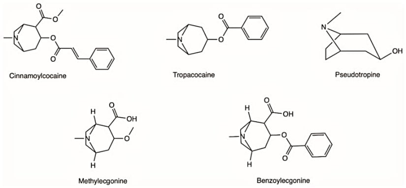Kokainin elde edildiği koka çalısı, Orta ve Güney Amerika'da yetişen Erythroxylum cinsinden bir bitkidir ve en önemli ikisi E. coca ve Erythroxylum novogranatense olmak üzere 250'den fazla tanımlanmış türü vardır; ancak kokain arzının çoğu E. coca Lam. var. coca'dan ('Bolivya' veya 'Huanuco' kokası olarak da adlandırılır) elde edilir. Koka bitkisi, eliptik bir şekle ve biraz keskin bir tepeye sahip büyük, kalın, koyu yeşil yapraklar sunar ve küçük kırmızı meyvelere sahiptir. Koka bitkisinin yapraklarında sinnamoilkokain, tropakokain, metilekgonin, benzoilekgonin (BE) ve psödotropin gibi yaklaşık 18 farklı alkaloid bulunabilir - bunların hepsi kokainden önemli ölçüde daha az öforik ve daha az toksiktir.