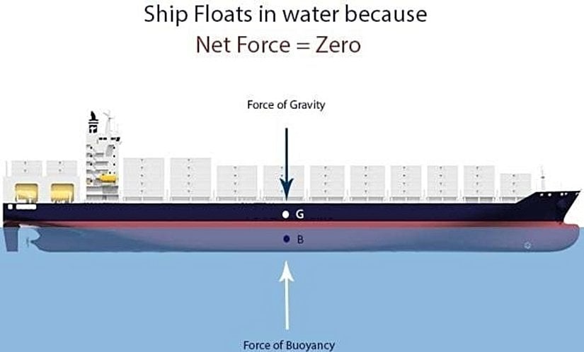 Marine InsightOrtalama yoğunluk: Geminin toplam kütlesini (çelik + kargo + yakıt + vs.), toplam hacmine (su altı + su üstü) böldüğünüzde elde edilen "ortalama yoğunluk", suyun yoğunluğundan daha az olur. İşte bu nedenle gemi yüzer.