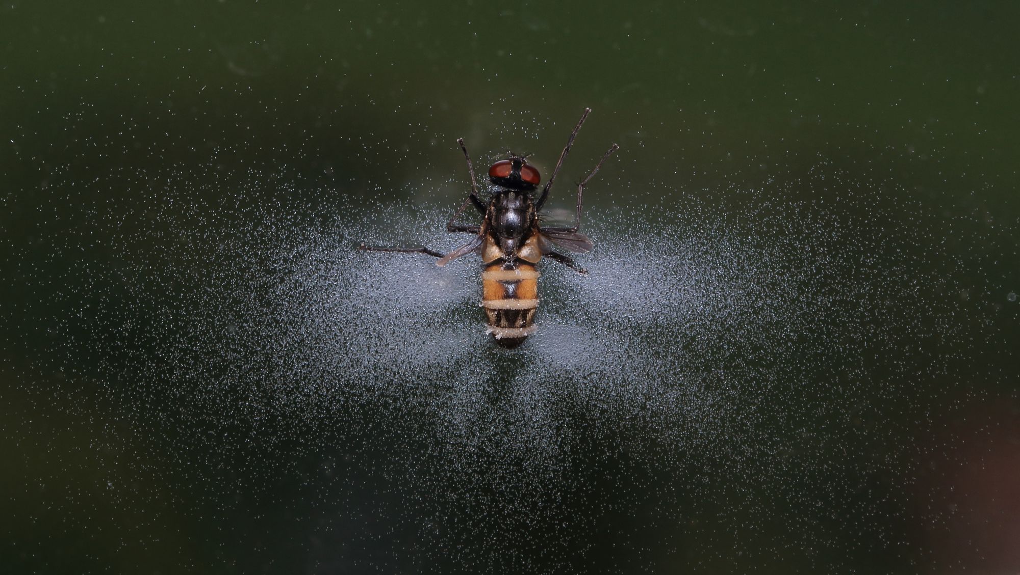 • Kanatlarını 90 derecelik bir pozisyona getirir ki bu duruş şekli aslında mantarın sporlarını kurban öldükten sonra fırlatması için harika bir pozisyondur. İşte masum sineğin bu ölüm pozu aslında Dünya’ya son selamıdır.