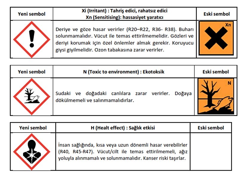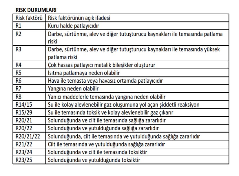 Kimyasalların içerdiği riskler, R (Risk) faktörleri olarak verilmektedir.