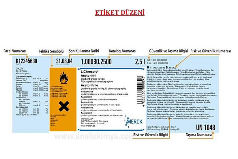 6. Laboratuvarlarda içinde kimyasal madde olan hiçbir kap etiketsiz olmamalıdır. Kullanmadan önce etiket dikkatlice okunmalıdır. Kimyasallar bir kaptan başka bir kaba aktarıldığında yeni kabın etiketlenmesi unutulmamalıdır. Etiket üzerinde hazırlanış tarihi, saklama süresi, numune sahibi, çözeltinin/numunenin özellikleri ve diğer gerekli olabilecek bilgiler yer almalıdır.