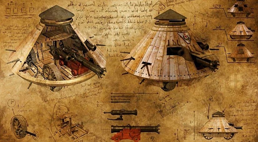 Bu zırhlı aracın taslağı da Leonardo’nun not defterinde bulundu. Bu taslakta aracın nasıl korunduğu, içindeki silahların nasıl ateşleneceği ve aracın nasıl yönlendirileceği görülüyor.