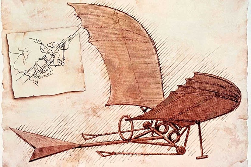 Bu uçan makinenin taslağı Leonardo’nun not defterinde bulundu. Bu taslakta kanatların nasıl açılıp kapanacağı, pilotun nasıl oturacağı ve makinenin nasıl hareket edeceği görülüyor.