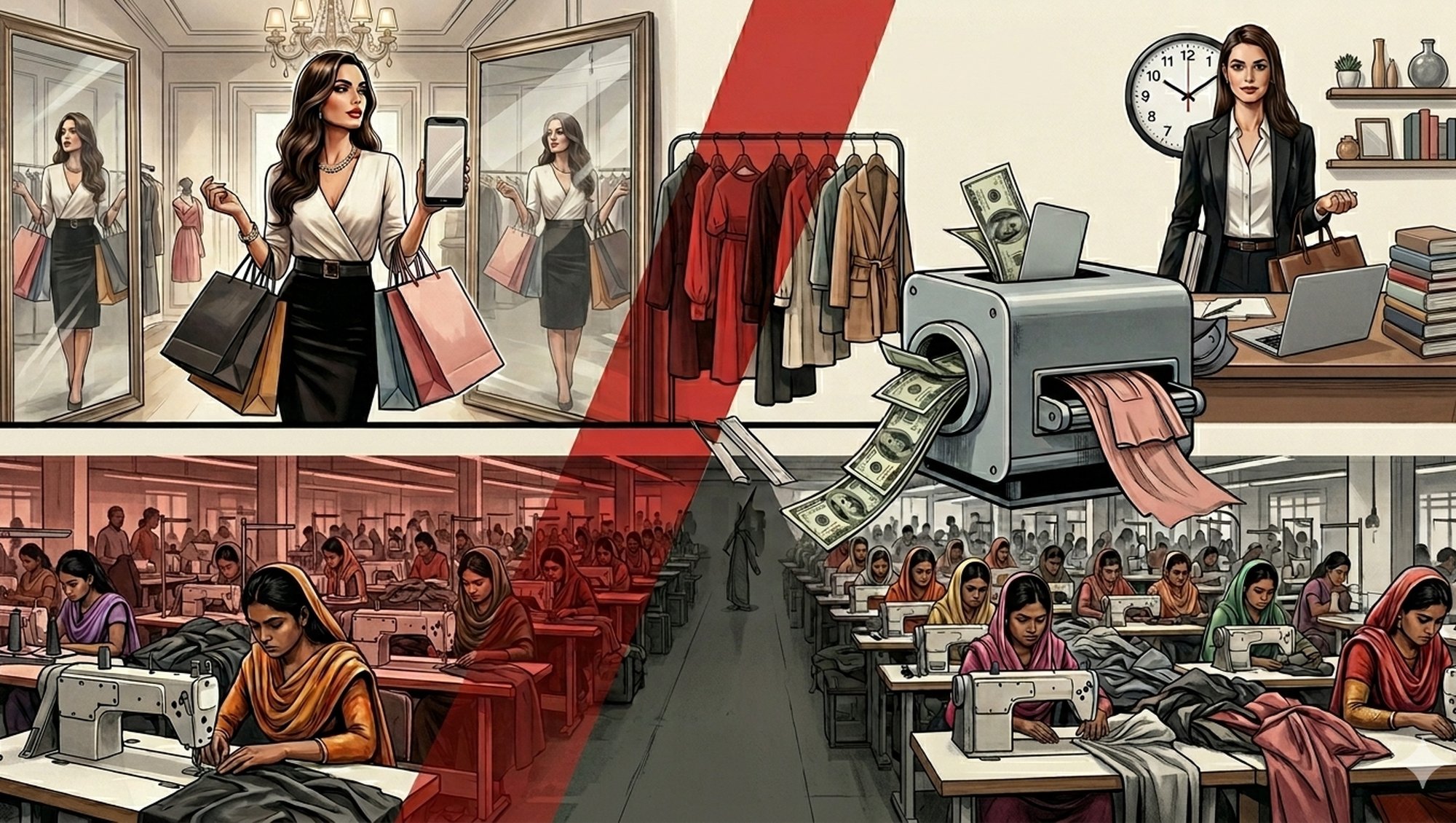 Modanın sunduğu "özgürlük" illüzyonunun en karanlık tarafı ise üretim aşamasıdır. Bugün gelişmiş dünyada bir vitrinden "feminist" sloganlı veya "özgürlükçü" bir parça satın alan kadın, madalyonun diğer yüzündeki sömürüyü genellikle görmez.