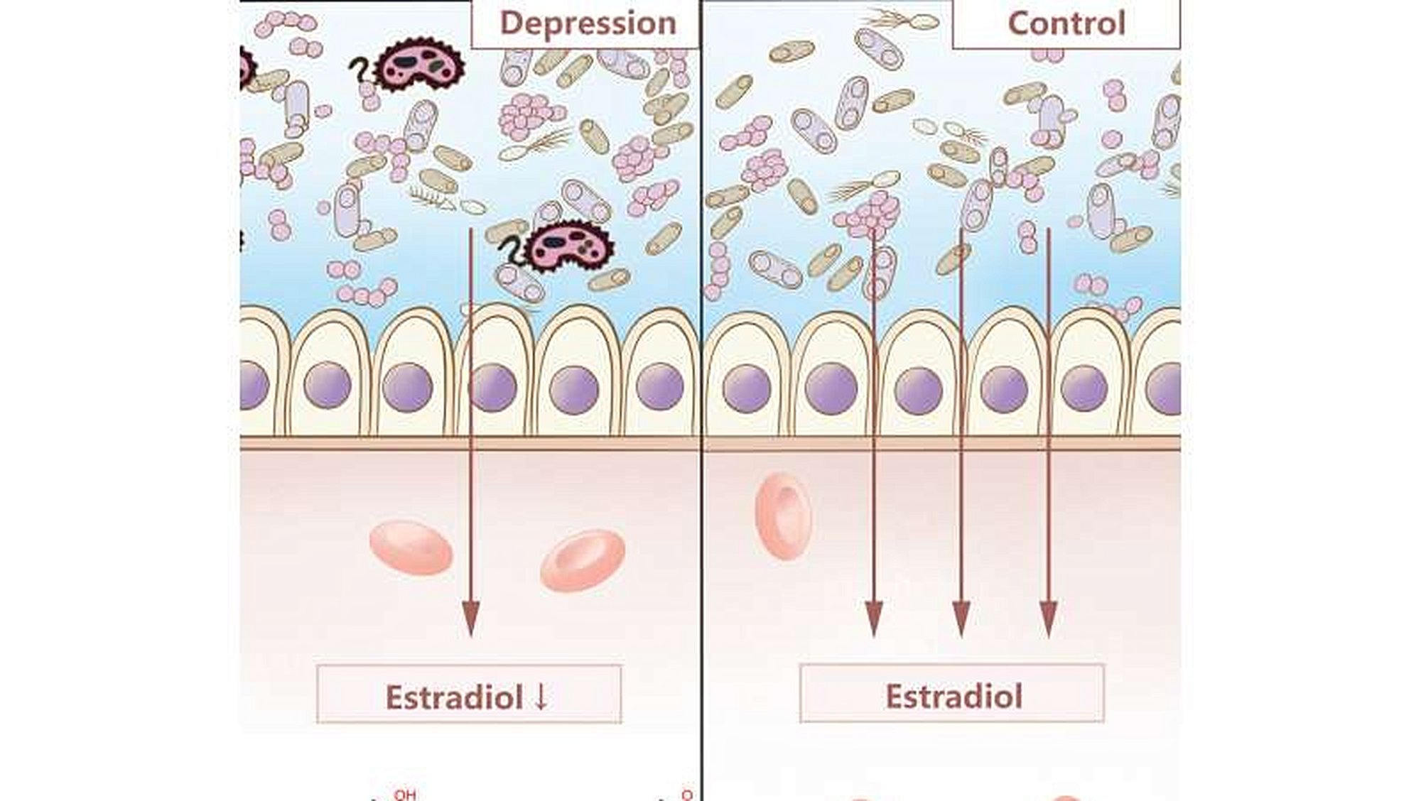Depresyonlu örnek mikrobiyomu farelere verildiğinde, kan östradiol seviyelerinde %25 azalma gözlendi. Davranış deneyleri, düşük östradiol seviyelerine sahip farelerde depresyon benzeri davranışlar gözlemledi. Bu sonuçlar, menopoz öncesi depresyonlu kadınların bağırsak mikrobiyotasının farelerde serum östradiol seviyelerini azaltabileceğini ve insanlarda gözlenenlere benzer depresyon benzeri davranışları uyandırabileceğini düşündürdü.