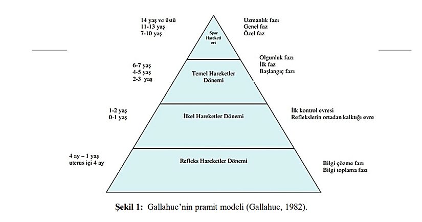 • Piramit modeline göre, her motor gelişim dönemi bir diğer motor gelişim dönemi üzerine kurulur Motor gelişimin temelini 0-1 yaş arasını içeren refleksif hareketler dönemi oluşturur. Bu dönemin devamında, 0-2 yaş aralığını kapsayan ilkel hareketler dönemi ve 2-7 yaş dilimini içeren temel hareketler dönemi gelir. Motor gelişimin son aşamasını ise piramidin en üstünde yer alan spor hareketleri dönemi oluşturur. Sporla ilişkili hareketler dönemi insan yaşamının 7 ve sonrası yaşlarını kapsar.