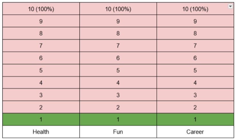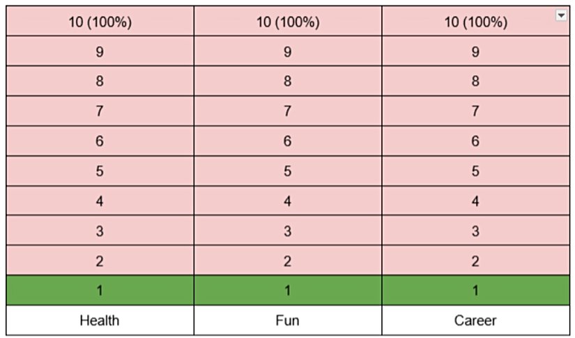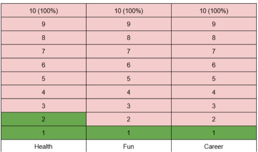 Diyelim ki sağlıkta 1, eğlencede 1 ve kariyerde 1 puanım var.