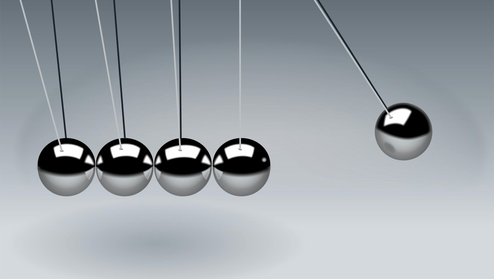 Yukarıdaki görseldeki bir Newton Denge Topu, diğer adıyla Newton Beşiği. İlk topu havaya kaldırınca potansiyel bir enerji yükleniyor. Bıraktığımızda bu potansiyel enerji yerçekiminin etkisiyle kinetik enerjiye dönüşüyor ve gidip ikinci topa değiyor. İlk topun momentumu, değdiği ikinci topa geçiyor. Bu şekilde momentum, sırayla diğer toplara iletiliyor ve en son topa kadar gidiyor. Bilim gerçek sihir’dir…