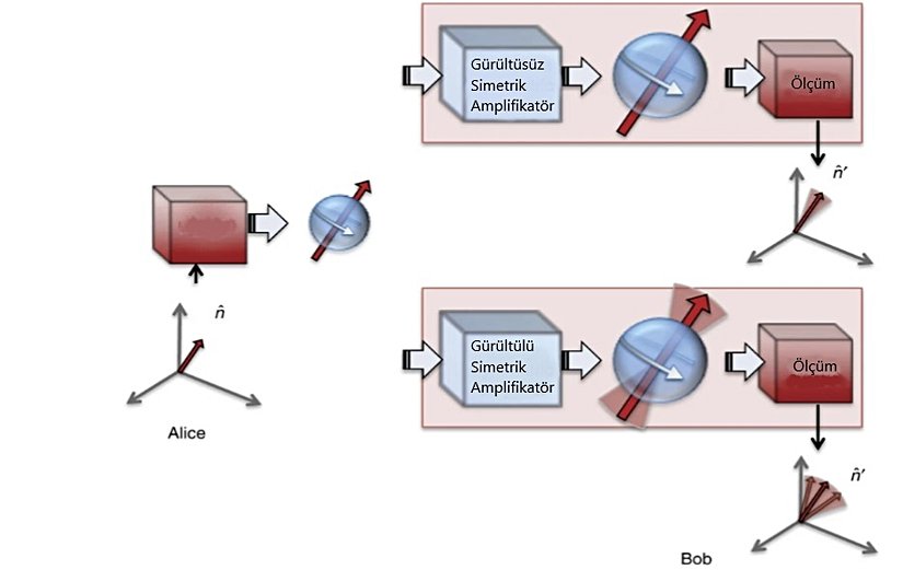 Dönme simetrik açık sistem dinamiğinin,( - )yönünde hizalanmış tutarlı durumu , dönme simetrik gürültüsüz bir amplifikatör olan tutarlı duruma dönüştürdüğünü varsayalım. Bu mümkün olsaydı açıklanan iletişim protokolünde , Bob önce bu dinamiği uygulayabilir ve sonra durumu kullanarak yönü tahmin edebilirdi. Böyle bir strateji, temel kuantum sınırının izin verdiğinden daha iyi olan ile orantılı varyansa sahip bir tahmin üretecektir.