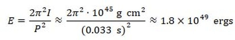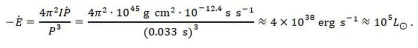olarak hesaplanabilir. Bulutsunun yaydığı ışıma (lüminozite), pulsarın dönüş hızından birim zamandaki enerji olarak aşağıdaki şekilde hesaplanabilir.