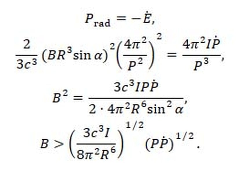 ise, denklemler yeniden düzenlenerek manyetik alan şiddeti B>Bsinα'ya bir alt limit konulabilir (burada bahsedilen nötron yıldızının yüzeyindeki alan şiddetidir). Burada α dönme ekseni ile manyetik eksen arasındaki bilinmeyen açıdır.