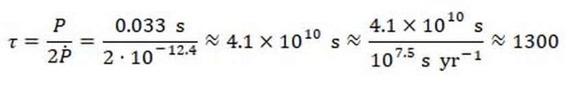 yıl olarak bulunur. Bu değer gerçek değerinden biraz daha fazladır. Fazla olduğunu biliyoruz çünkü Yengeç süpernovası 1054 yılında gözlendi, yani bu pulsarın gerçek yaşı hakkında net bir fikir sahibiyiz ve bu da bize teorik hesaplarımızı kıyaslamak için şahane bir örnek oluşturuyor.