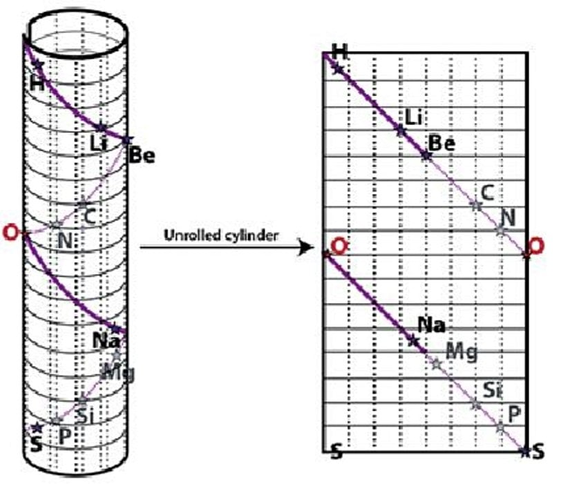 Elementlerin artan atom ağırlıklarına göre spiral bir eğilimde bir silindir üzerinde bulunduğu bu sistemde, de Chancourtois benzer özellik taşıyan elementlerin dikey bir sırada yerleştiğini gözlemledi. Kendisinin 1863 yılındaki yayınında yer alan bir tablo elementlere ek olarak iyonları ve bileşikleri de kapsadı, fakat asıl olarak yayımladığı Comptes rendus de l'Académie des sciences (Bilim Akademisi Tutanakları) adlı makalesinde kimyasal terimlerden ziyade jeolojik terimleri kullandı ve bir diyagram kullanmadı. Sonuç olarak, de Chancourtois’in düşünceleri Dimitri Mendeleyev’in çalışmaları yayımlanana kadar dikkat çekmedi...