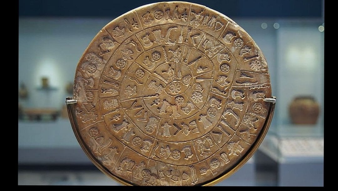 1908’de İtalyan bir arkeolog Phaistos'un Antik Minoan sarayına girdi ve burada bir disk buldu. Arkeolojinin gizemli buluntularından biri olarak kabul edilen disk, M.Ö. Geçmişi 1650’li yıllara kadar uzanır ve Phaistos diski olarak adlandırılır. Diskin bir yeraltı tapınağında bulunması, bunun dini açıdan önemli olduğunu gösteriliyor. Bu koyu kahverengi 16 cm çapında, 1,6 cm kalınlığındaki disk pişmiş kilden yapılmıştır ve her iki tarafı da diskin merkezine doğru saat yönünde dönen garip sembollerden oluşan bir spiral ile çevrelenmiştir. 45 farklı karakter arasında oklar, kediler, kartallar, yürüyen adam, zambaklar, yunuslar gibi simgeler ve daha fazlası bulunur. Dilbilimciler bu diskteki simgeleri bir yazı sistemine dönüştürmeye çalıştılar ancak simgelerin ne anlama geldiğini henüz bulamadılar. Bazı araştırmacılar metnin kutsal tanrıçalar, astronomi belgesi, labirent açıklaması gibi şeyler olabileceğini düşünüyor.