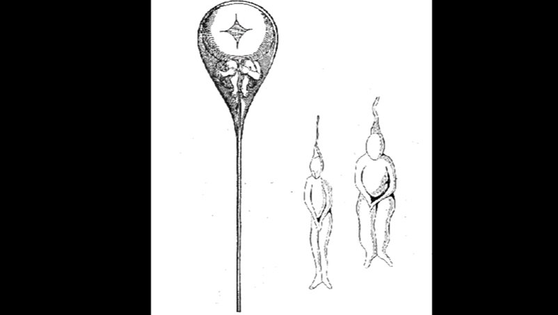 A homonculus inside a sperm cell, as drawn by Nicolaas Hartsoeker in 1695
