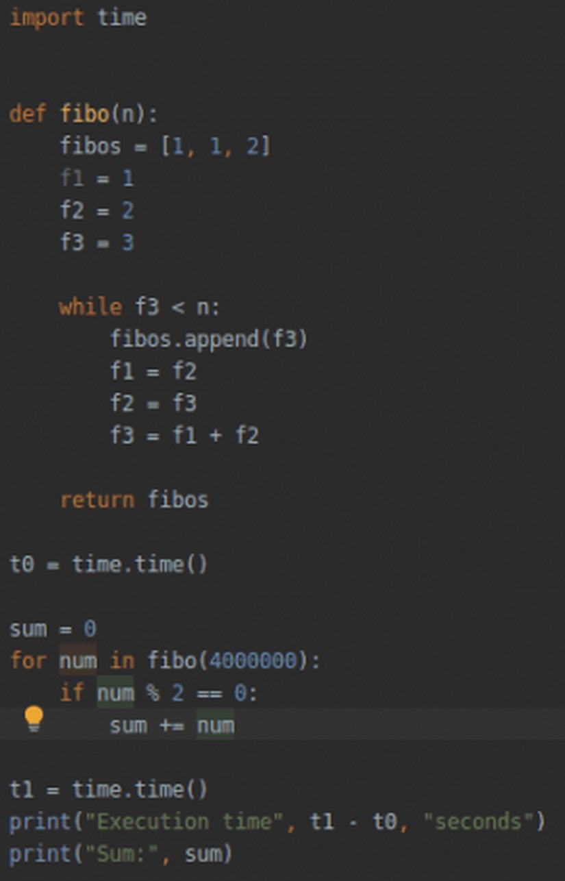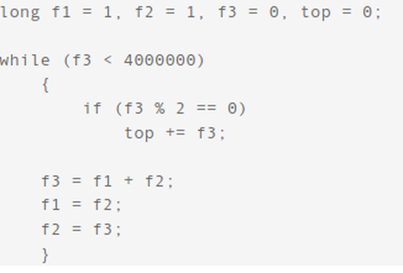 Project Euler 2: Fibonacci dizisindeki her yeni terim, önceki iki terimin toplamıdır. 1 ve 2'den başlanarak ilk 10 terim şu şekildedir: 1, 2, 3, 5, 8, 13, 21, 34, 55, 89, ... Dört milyonu aşmayacak şekilde çift Fibonacci terimlerinin toplamı nedir?Project Euler 2 sorusuyla birlikte algoritma sorularının vazgeçilmezi olanFibonacci dizisiyle karşılaşıyoruz. Fibonacci dizilerini elde edebileceğiniz birçok algoritma mevcut, mutlaka bunlara göz atmanızı öneririm. Özellikle özyinelemeli (recursive) fonksiyonlar konusunun vazgeçilmez örneklerindendir. Burada oldukça basit bir metodu kullanacağım. Öncelikle Fibonacci dizisini elde edeceğimiz algoritmayı belirleyelim, ardından 4000000'a kadar olan bu sayılardan hangileri çift onlara bakacağız ve çift olanların toplamının kaç ettiğini bulacağız.