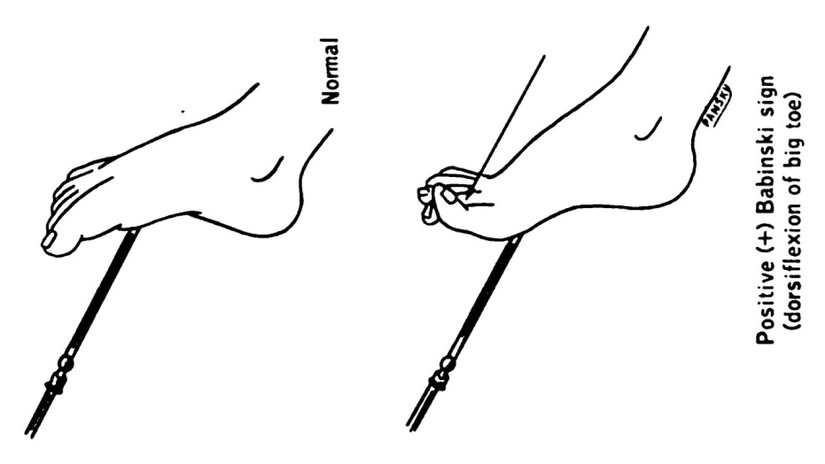 Babinski Refleksi: Ayak tabanının dış tarafına uygulanan darbe sonucu ayak parmakları özellikle baş parmağın yukarı doğru kalktığı görülür. Bu refleksin yokluğu üst motor nöronlarda hasar olduğunu gösterir.