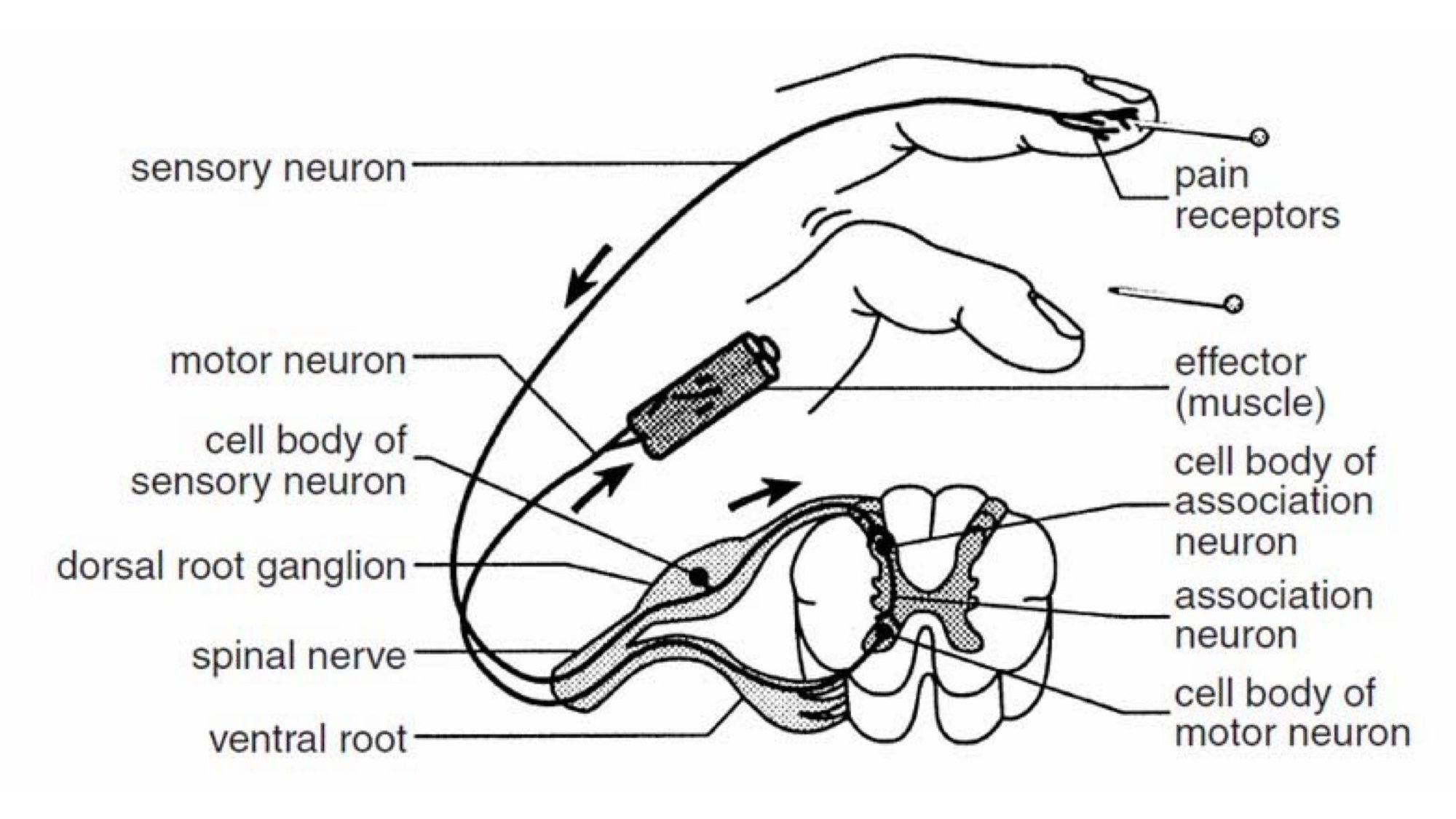 Bir refleks arkının oluşmasında bir reseptör organ, bir afferent nöron, bir merkez (beyin ve omurilikte), bir efferent nöron, bir effektör organ (kalp ve düz kas, iskelet vb.) yer alır. Refleks arkı refleksin meydana geldiği anatomik yapıdır.
