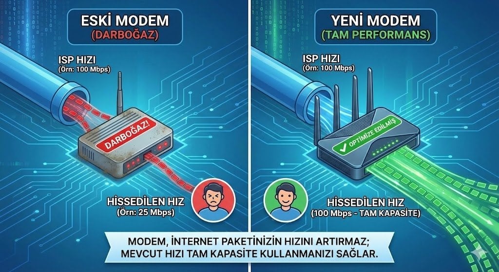 Eğer modeminiz 5 yıldan eskiyse veya Wi-Fi kapsama alanında sorun yaşıyorsanız, yeni bir cihaz "hissedilen" hızı ve stabilititeyi artırır. Ancak internet paketiniz zaten düşük hızdaysa, donanım değişikliği ana bant genişliğini yükseltmeyecektir.