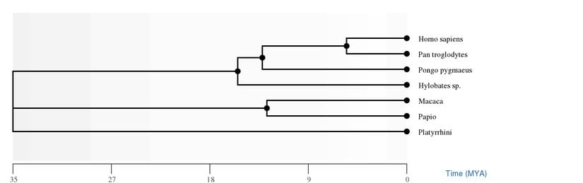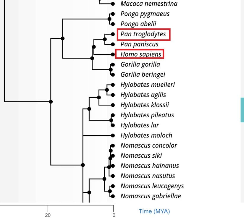 TimeTreeÖrneğin insan ile şempanzenin evrimsel ayrışma zamanını 5.8 milyon yıl öncesi olarak gösteren, dolayısı ile benzerliğin farklı olduğu bu çalışmada, insanın şempanze ile olması gerektiği ölçüde yakın olduğu görülebilir.[4], [5]