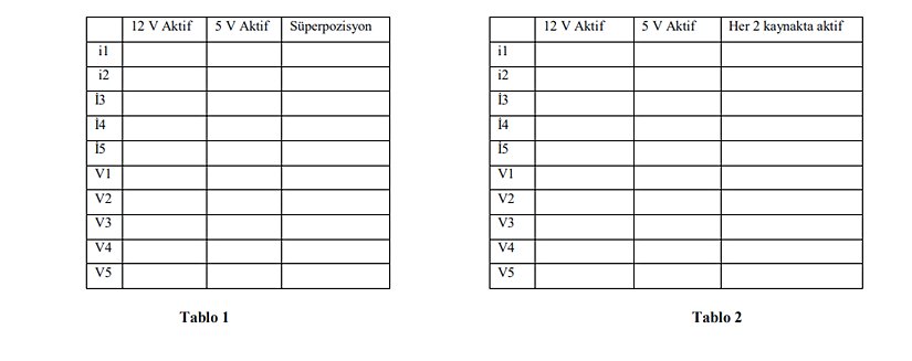 - 2. Aynı devrede bu kez 5 V'luk gerilim kaynağını kısa devre yaparak bütün akım değerlerini ve dirençler üzerindeki gerilim değerlerini bulunuz. Tablo 1’de yerine yazınız.