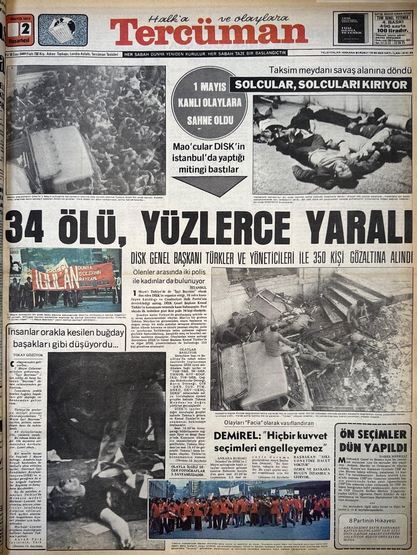 1 Mayıs 1977 Taksim Katliamı (Kanlı 1 Mayıs), Türkiye işçi sınıfının ve solunun yükselişini kırmak amacıyla planlanan en büyük kontrgerilla operasyonlarından biridir. Yarım milyonu aşkın insanın katıldığı mitingde, Sular İdaresi ve Intercontinental Oteli'nden açılan çapraz ateş ve panzerlerin kitleyi dar sokaklara sürmesi sonucu 34 kişi yaşamını yitirmiştir. Eski solcu ve liberal tarihçi Halil Berktay'ın yıllar sonra Taraf gazetesinde ortaya attığı "Ateş açıldığı palavradır, Maocular ve TKP'liler çatıştı, kendi rezaletlerinden mağduriyet yarattılar" şeklindeki iddialar, aslında onyıllardır polisin, MİT'in ve devletin ürettiği resmi yalanların bir tekrarı niteliğindedir.