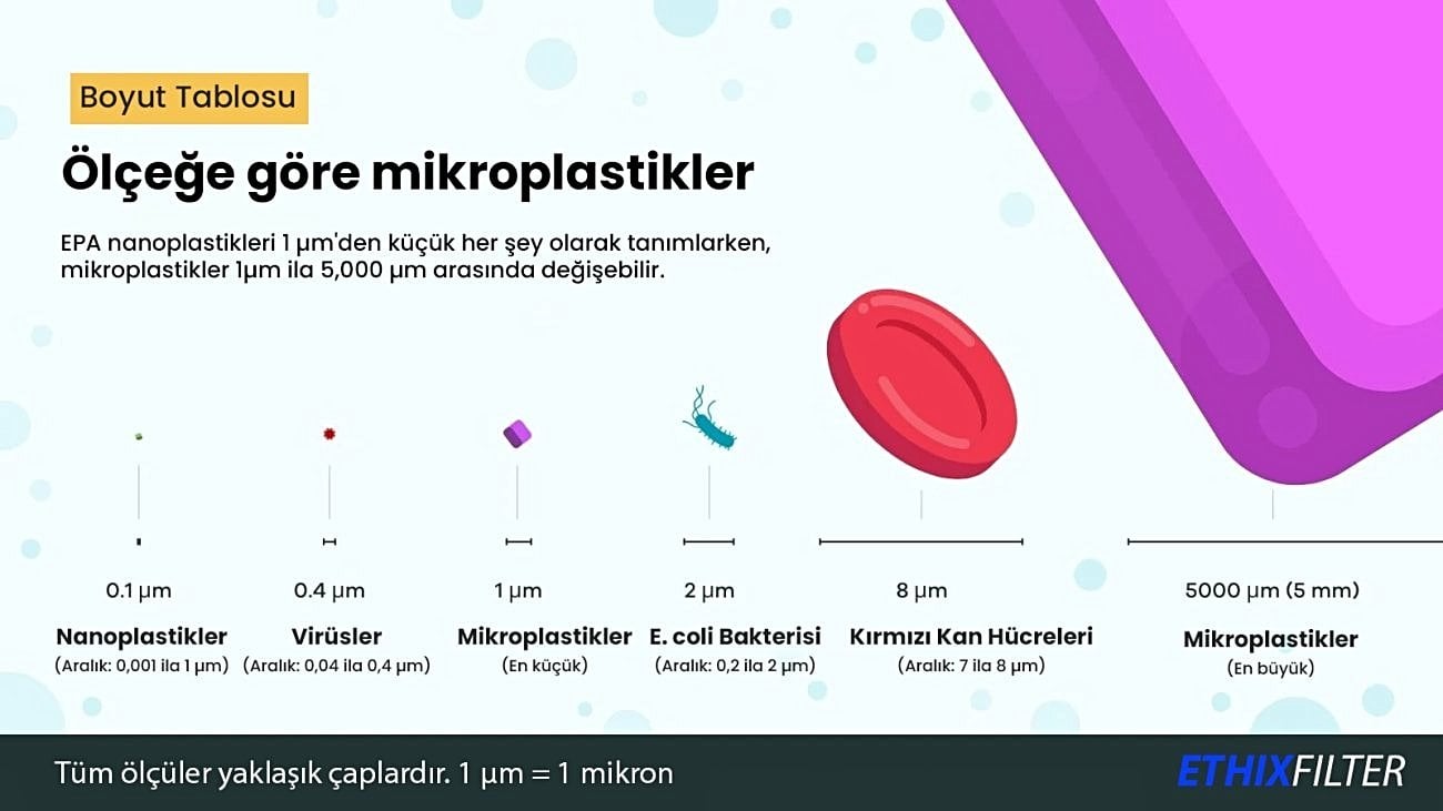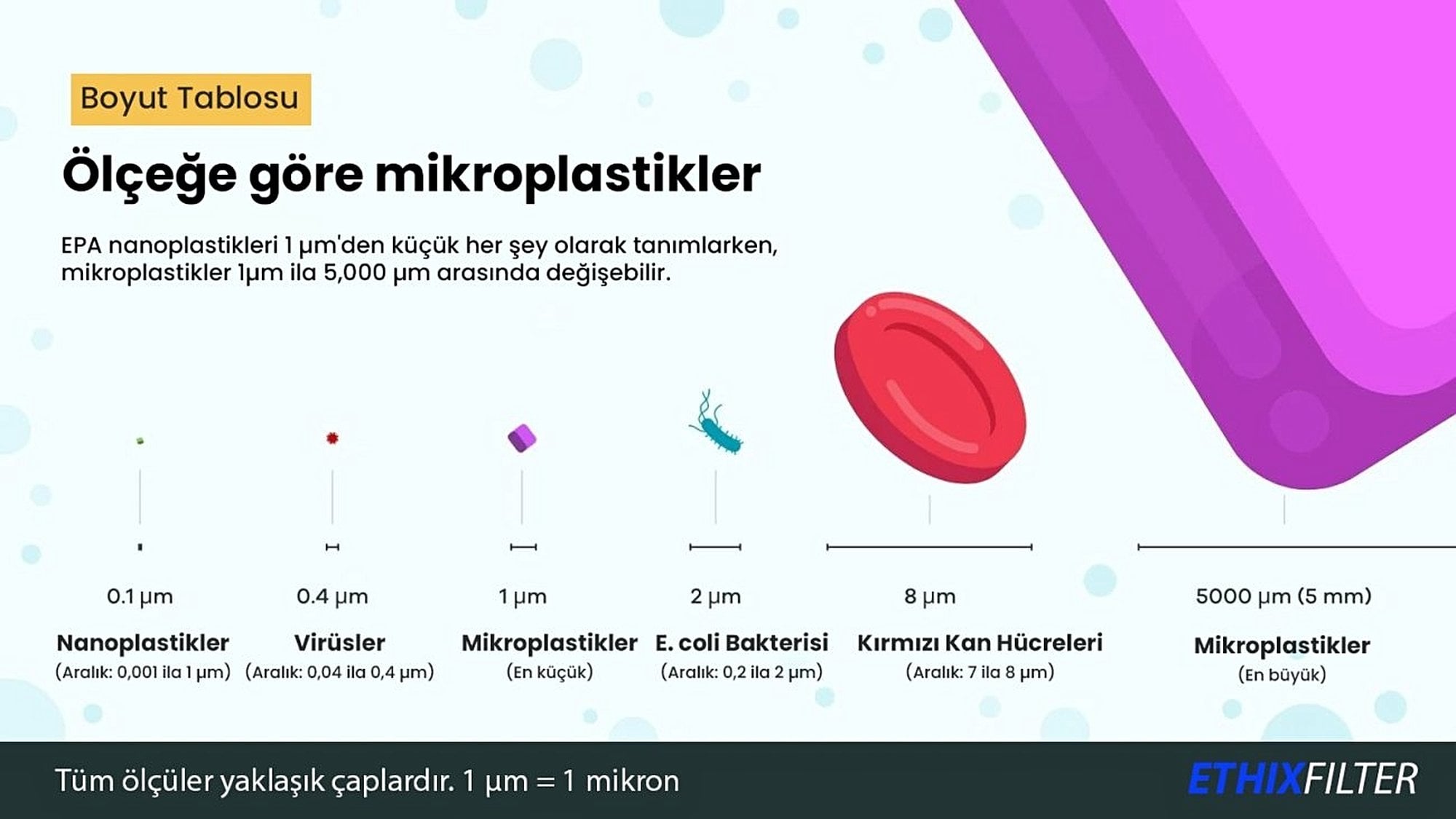 Ölçeğe Göre Mikroplastik ve Nanoplastiklerin Boyut Farkını Gösteren Tablo