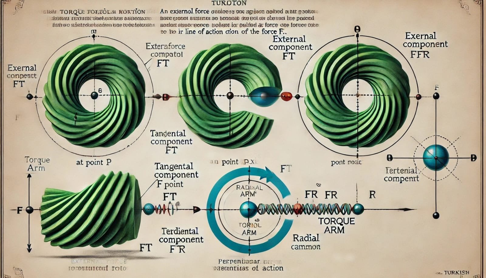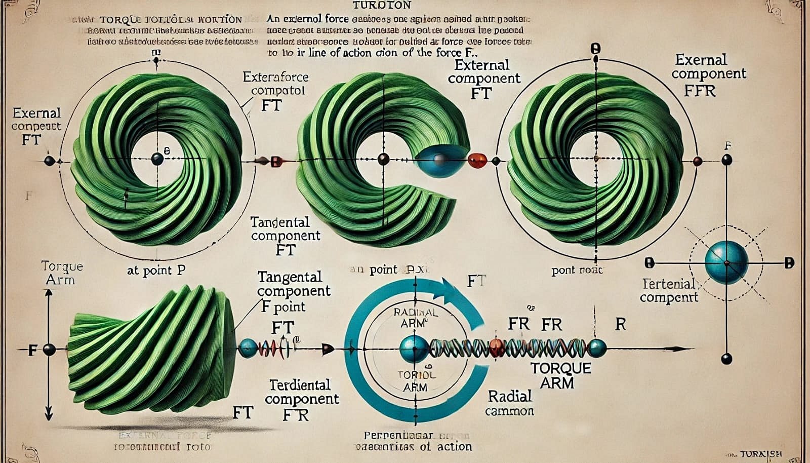 -F'nin cismin dönme ekseni etrafında dönme hareketine nasıl yol açtığını anlamak için F'yi iki bileşene ayırırız. F_r, radyal bileşeni adı verilen bileşen, r yönündedir. Bu bileşen dönmeye yol açmaz çünkü uygulanma yönü, O noktasından geçen bir doğru üzerindedir.F'nin diğer bileşeni, F_t teğet bileşeni ise r'ye dik olup büyüklüğü F_t = F sin φ'dir. Bu bileşen dönmeye yol açar.