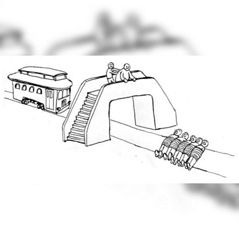 Şimdi bu ikilemin ikinci bölümünü ele alalım. Tramvay hatlarının üzerinde bir üst geçitte durduğunuzu hayal edin. Tramvayın hiçbir şeyden habersiz beş işçiye doğru yaklaştığını net bir şekilde görebilirsiniz. Ama onu kontrol edecek bir kulp da yok.